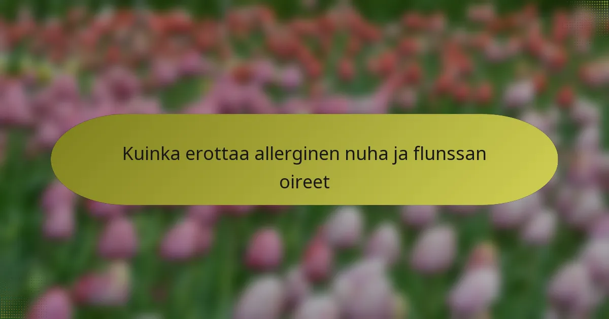 Vaikka molemmilla tiloilla on yhteisiä oireita, on olemassa keskeisiä eroja. Allergiat aiheuttavat yleensä kutisevia silmiä ja kirkasta, vetistä nenäeritystä, kun taas flunssa voi johtaa paksumpaan limaan ja kuumeeseen. Lisäksi allergiaoireet voivat jatkua niin kauan kuin allergeeni on läsnä, kun taas flunssaoireet yleensä paranevat viikon kuluessa.